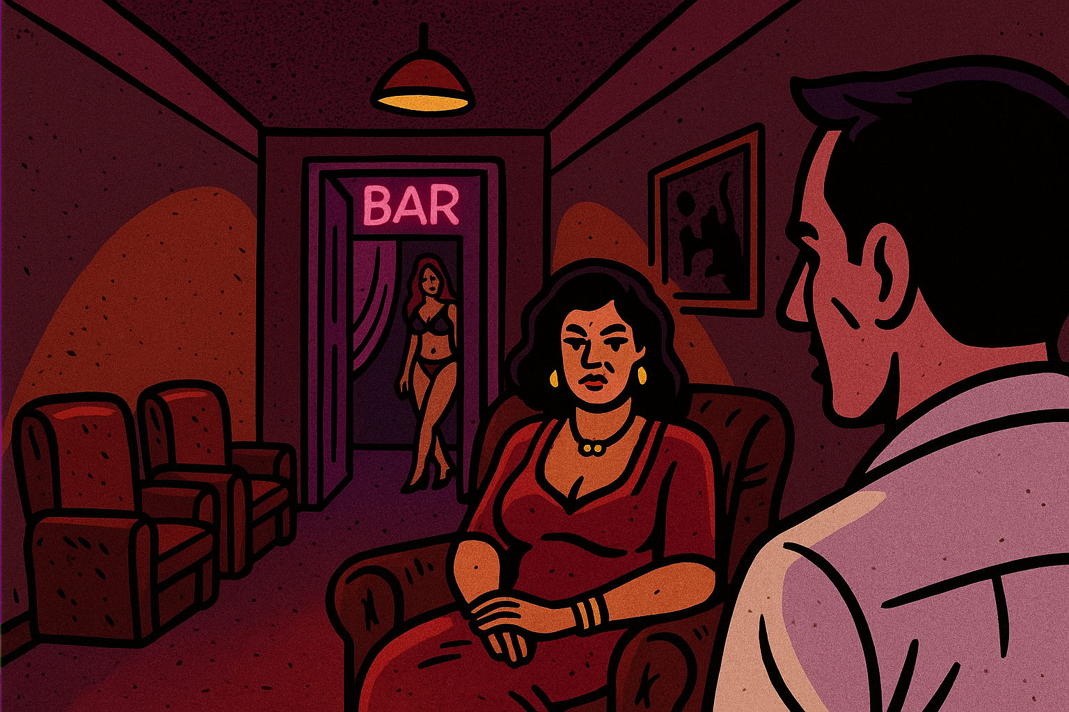 De un lado una whiskería de los años 90: un pasillo tenue, sillas de cuero gastado, una mujer que maneja la casa, un cliente que entra mirando hacia los costados.