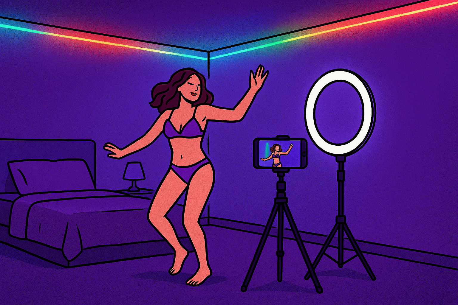 En la otra, un dormitorio en Pocitos con luces LED de colores, un iPhone sobre un trípode y un aro de luz blanca.  La transacción ocurre sin que nadie cruce una puerta ni haga señas con luces del auto en la esquina; basta con un enlace, una llamada.